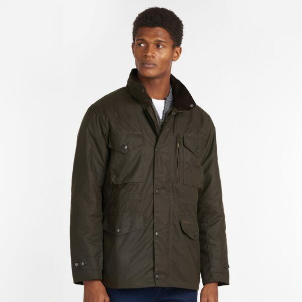 A könnyű, 6 unciás viaszos pamut öt külső zsebet foglal magába: két alsó és két felső, patenttal záródó zsebet, valamint egy titkos, cipzáras zsebet a bal mellkason, diszkréten elrejtve. A mandzsetta szűkíthető, patenttal állítható, a kabát záródása pedig cipzáras és patentos kombináció. A gallér jellegzetes kordbársony szegélyt kapott.
